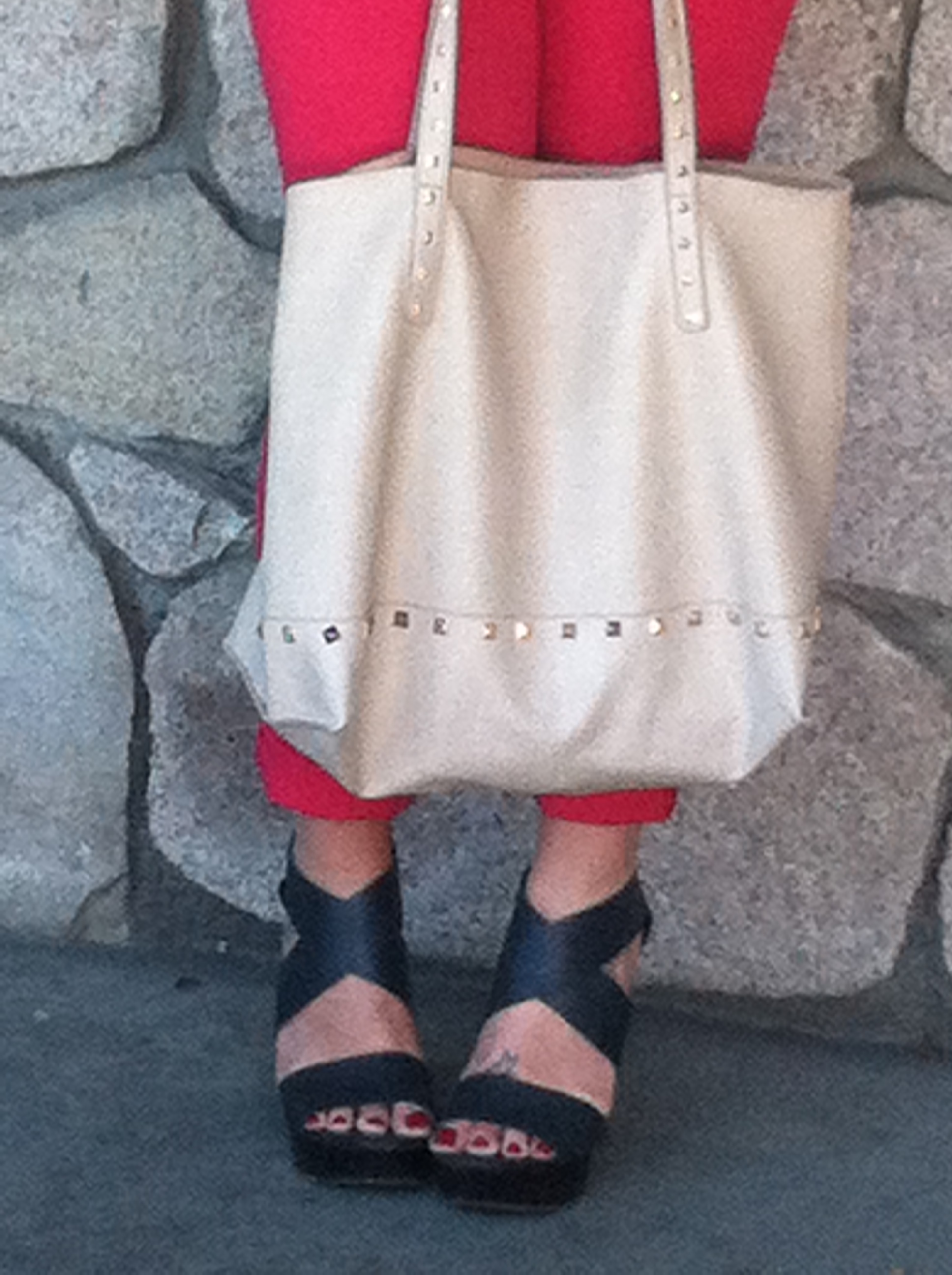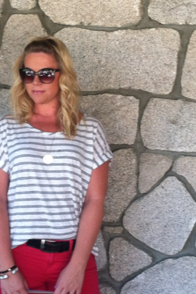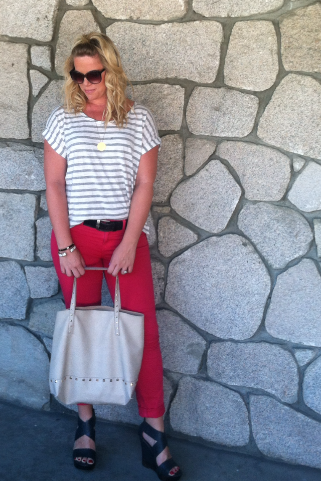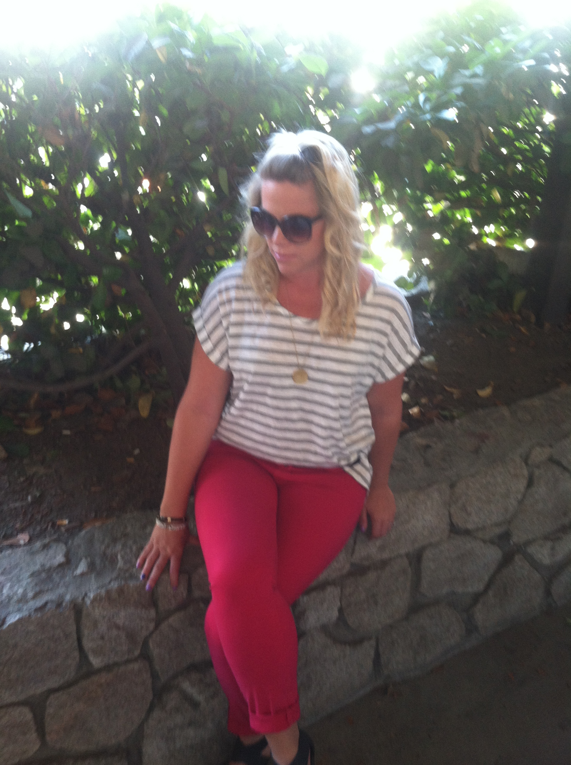 A pop of color on a bright summer day is as obvious as vodka with tonic! I met a girlfriend for lunch today and pulled out my favorite red skinnies that have been hiding all summer. I paired mine with an oversized T, half tucked, and a pair of black wedges. I forgot how much I love them!