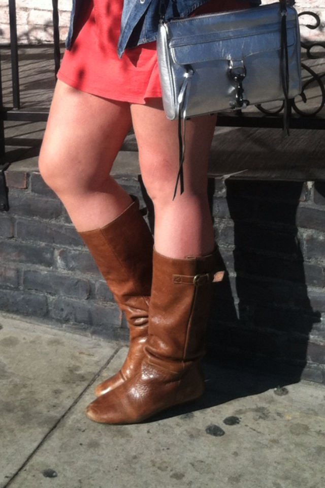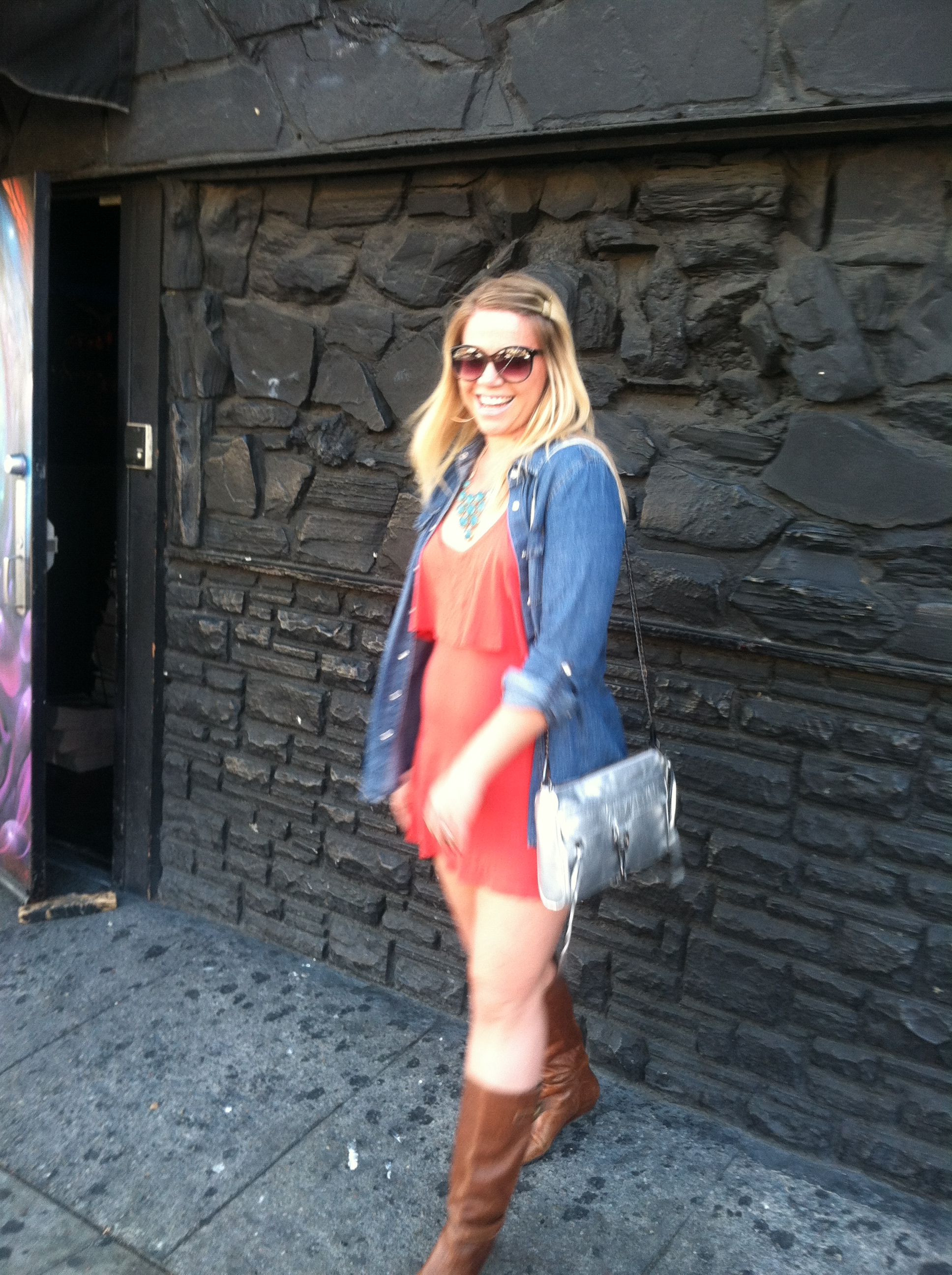 Dress: Blue Life C/O Poppi Boutique, Chambray Shirt: GH Bass (also seen HERE and HERE), Boots: Aldo (also seen HERE), Bag: Rebecca Minkoff, Midi Rings: H&M, Sunglasses: Target, Necklace: DenM Boutique