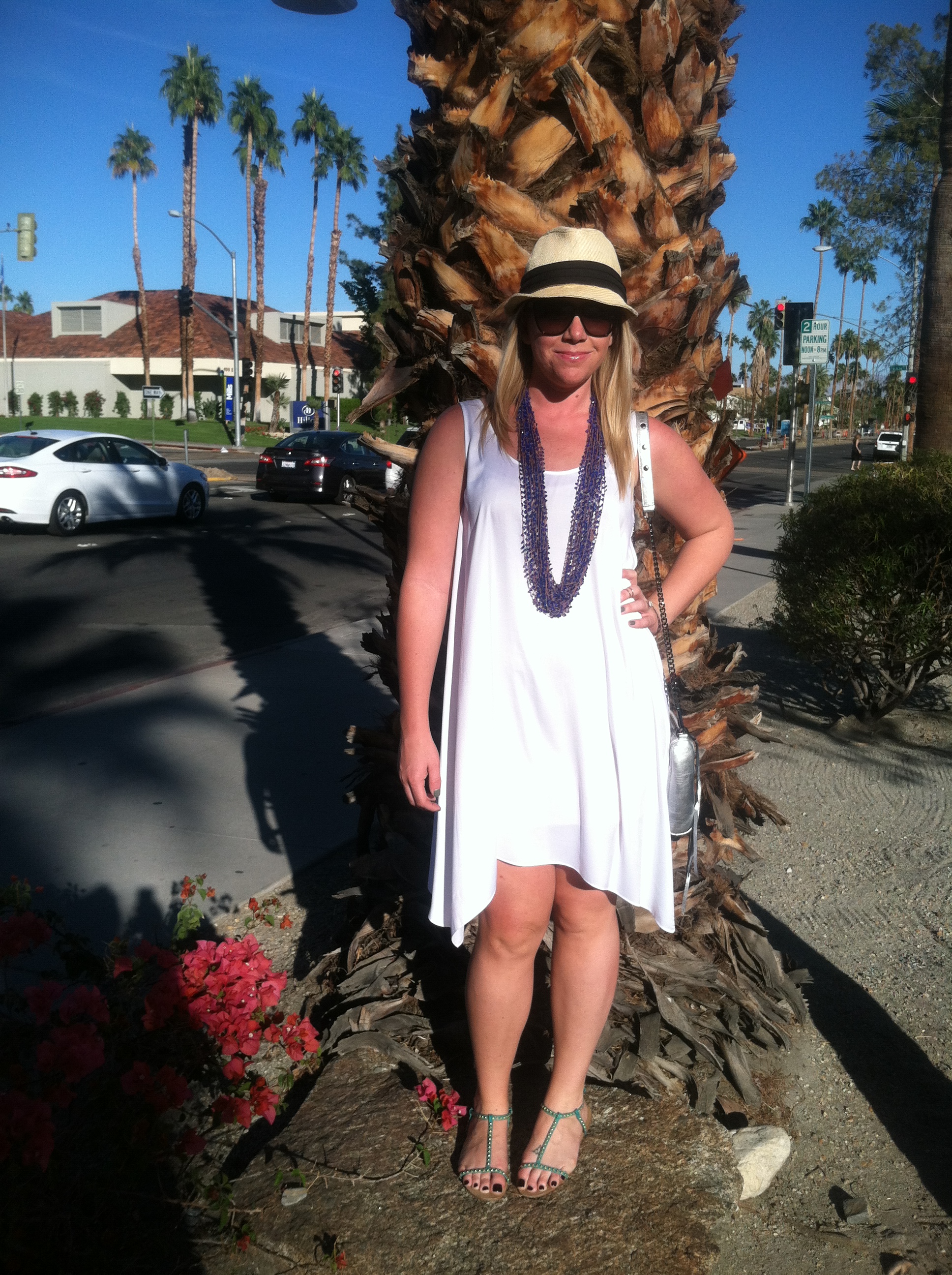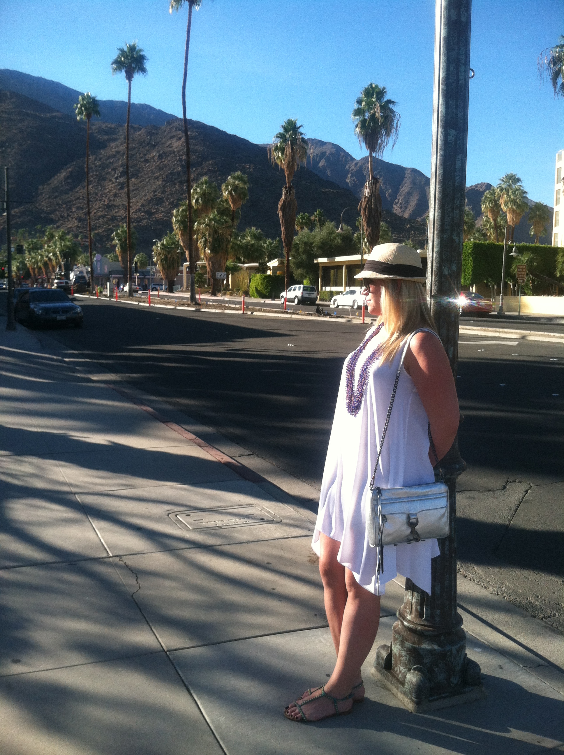 Just in case you missed it, yesterday’s blog was part 1 of my Palm Springs getaway. I was blessed with temperatures in the upper 80s and gorgeous sunshine! Part of my project on this escape from the cooler weather was to re-wear some of my favorite items in a different way than I normally wear them. I spent the day enjoying lunch and wandering the adorable downtown and was SO happy I brought this loose white dress along. Typically I pair it with a jacket or belt to give a bit more shape but the loose flowy fabric was perfection for the balmy day!