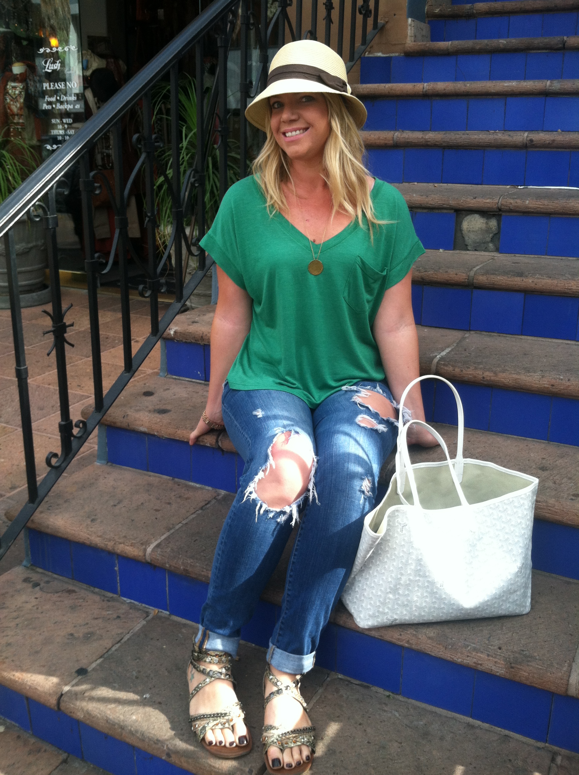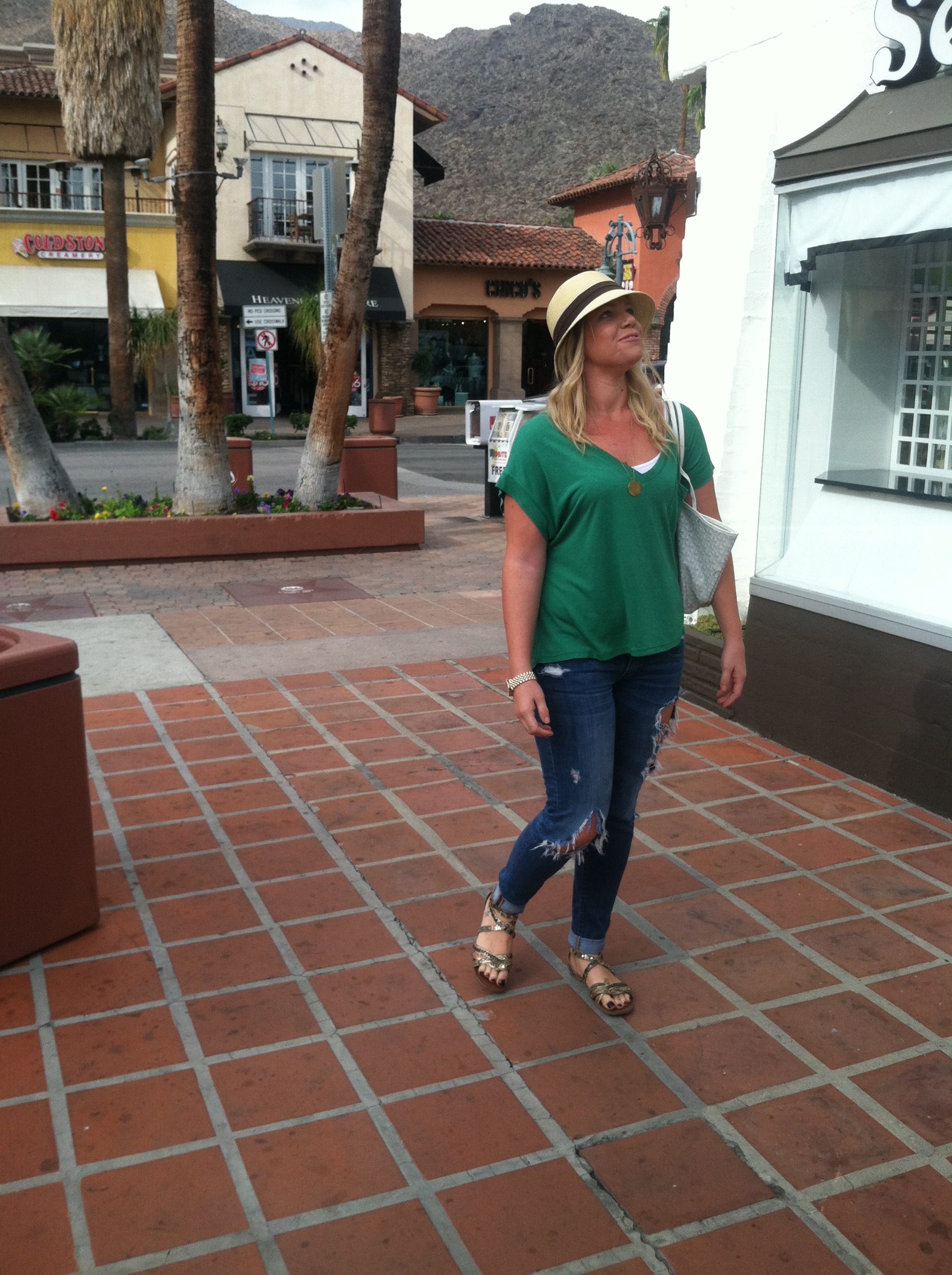 Jeans: Abercrombie & Fitch “Brett” fit, T-Shirt: Gibson for Nordstrom, Necklace: Gorjana & Griffin (also seen HERE), Sandals: a random Miami find, Hat: a random Palm Springs souvenir shop, Bag: Goyard Watch: Charming Charlie’s