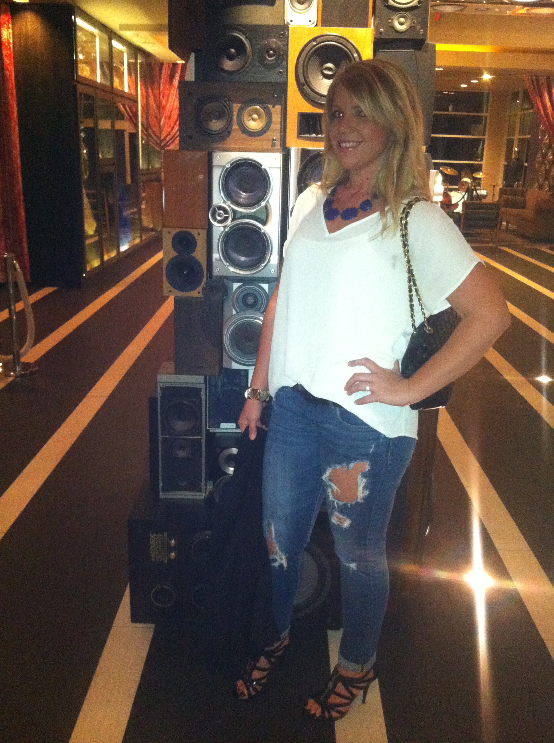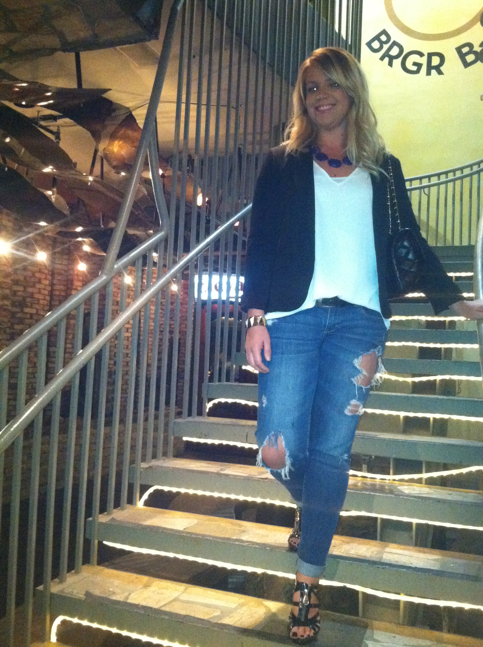 Where better to wear distressed jeans than a rock and roll inspired hotel?!  These jeans are making their rounds (check out this article on Who What Wear)!  I opted to pair mine with a blazer and cage heels for a slightly dressier approach.