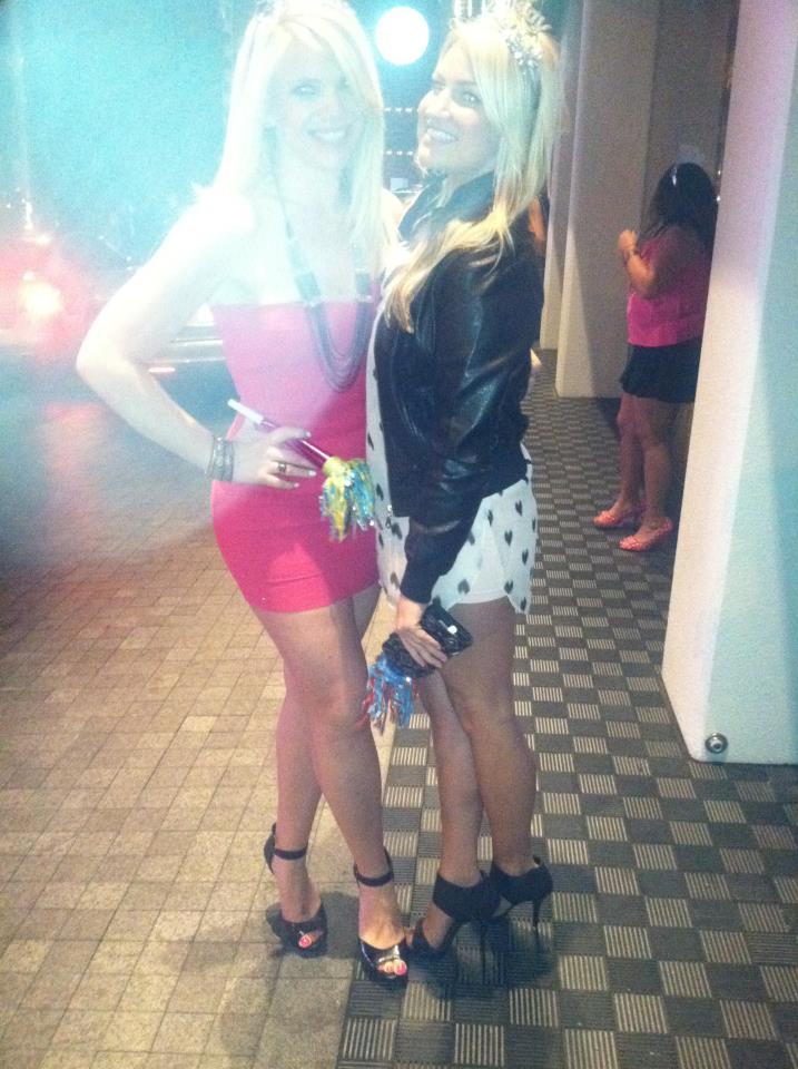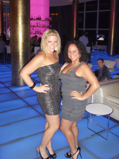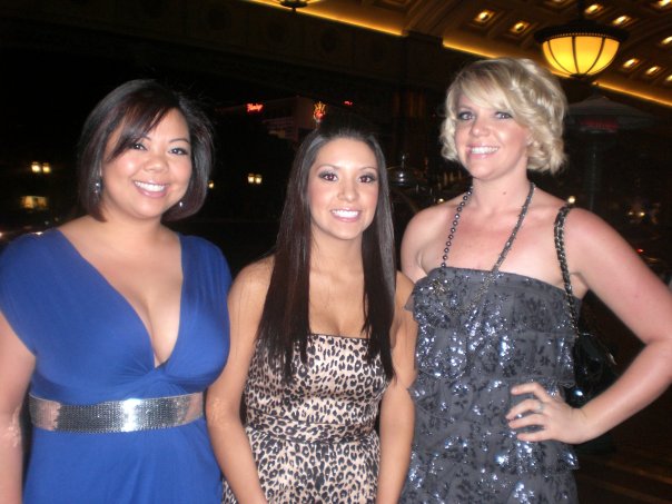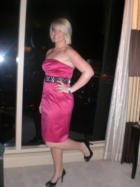 27 – Hot Pink strapless from The Limited with studded belt and peep toe heels, Grey ruffle tiered strapless from Express with silver Chinese Laundry strappy heels in Vegas.