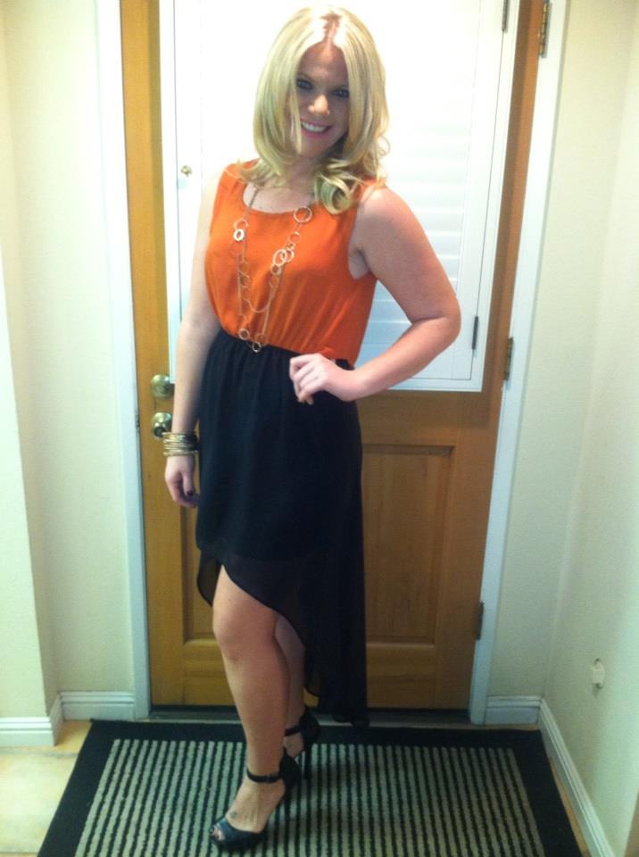 31 – My first “grown up” birthday was just a dinner for my closest friends at the Mission Inn. The dress was an orange and black hi-lo dress from Leroy’s in Lake Arrowhead with my Joey O heels.