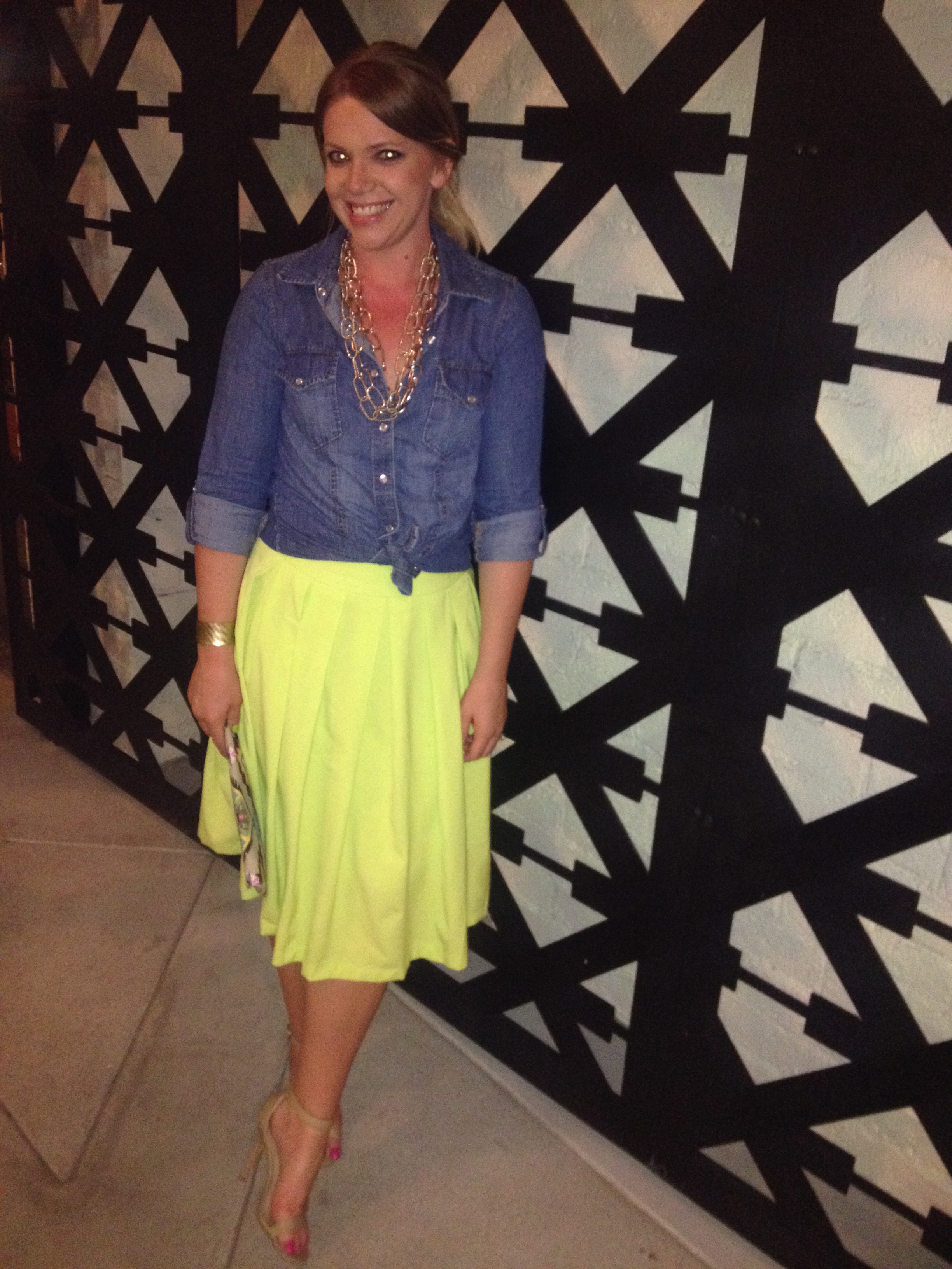 Skirt, Clutch, Cuff: Paperdolls Boutiqe, Denim Shirt: GH Bass, Necklace: Charming Charlie, Heels: Steve Madden