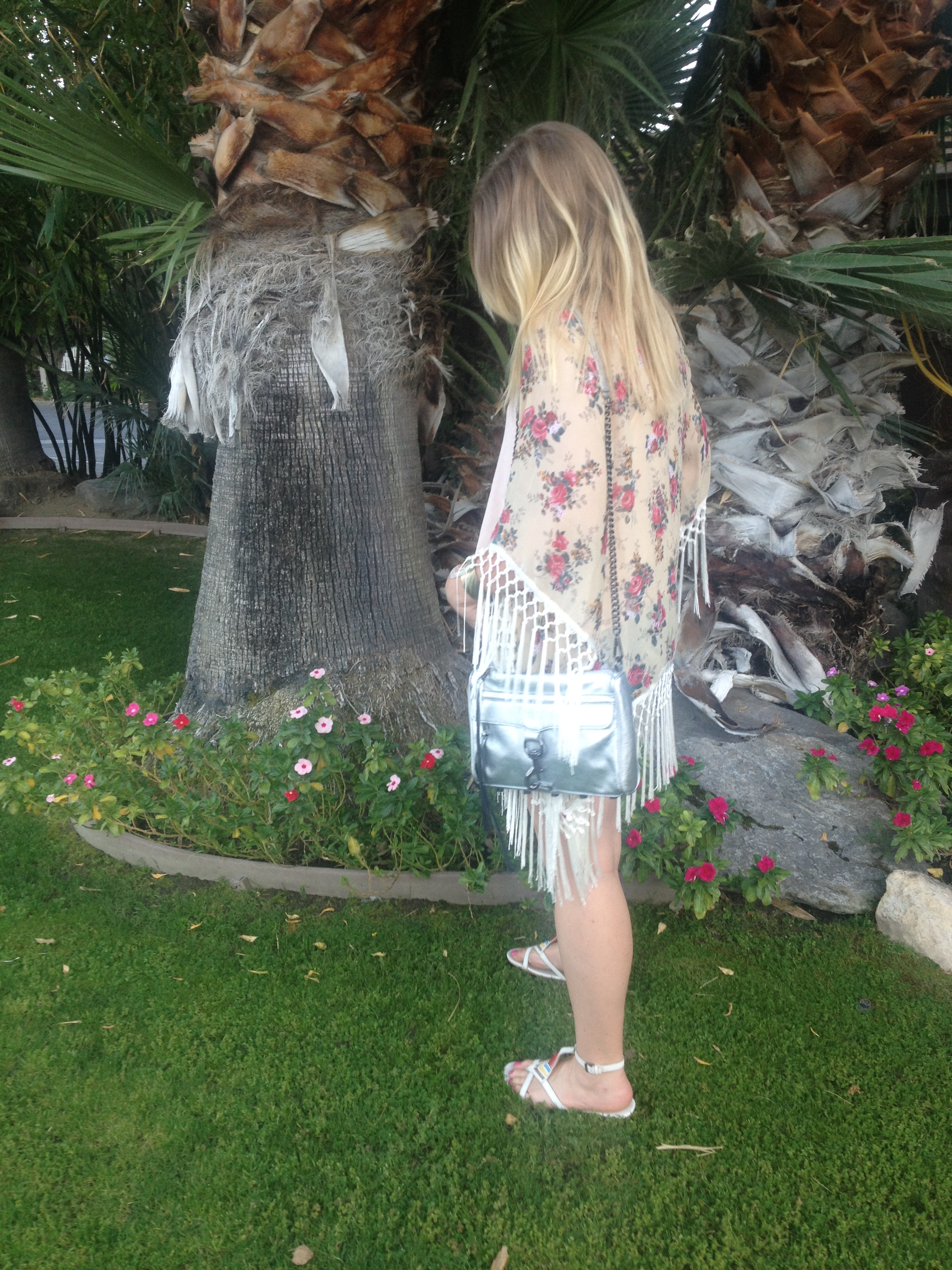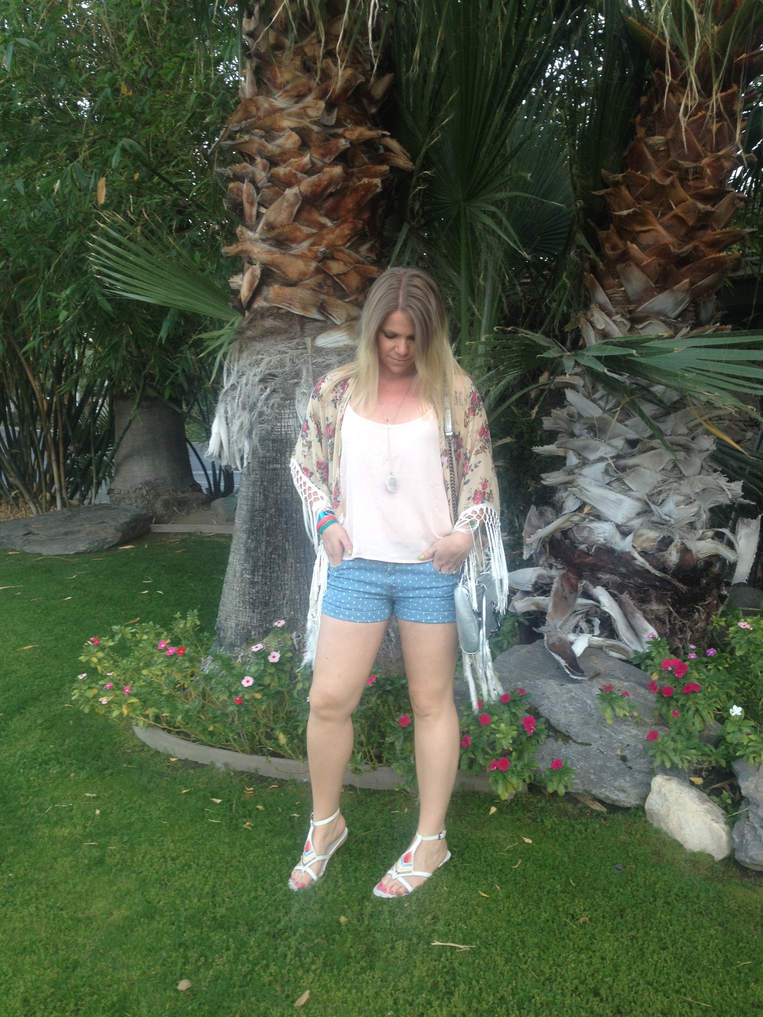 Floral lovers rejoice! I have stumbled across a fab, LA based clothing line that may just love floral prints more than you (or I) do! Alexis N Ryan is the baby of designer, Brittany Saberhagen, who grew up with a love of colorful, floral pieces typically found in vintage shops. I stumbled across the line in the Tide Style Villa at “Music Lounge” where they were gifting the fabulous celebs with 1940s inspired dresses, fringe kimonos, and adorable shorts. I was lucky enough to get my hands on the “Abby” kimono that Jennie Garth, Alexandra Starlight (of Alexandra and the Starlight Band, nat!), and Sydne Summer were lusting after! I seriously could not wait to wear this pink and rose-colored fringe kimono! I kept with the Coachella vibe for an extra few days and paired the statement piece with shorts and my new sandals with simple, straight hair for drinks at The Ace Hotel and Swim Club.