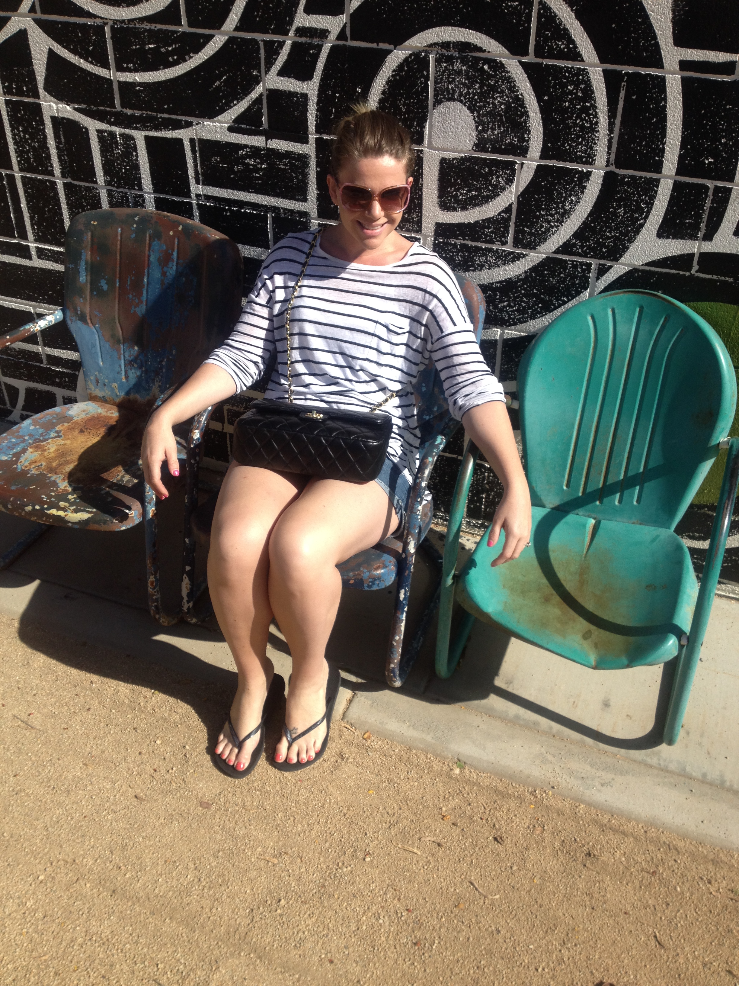 Shorts: Forever21 (I’m obsessed with the fit of their shorts), Striped Top: Vince, Flip Flops: Havaianas “Slim”, Sunnies: Juicy Couture, Bag: Chanel