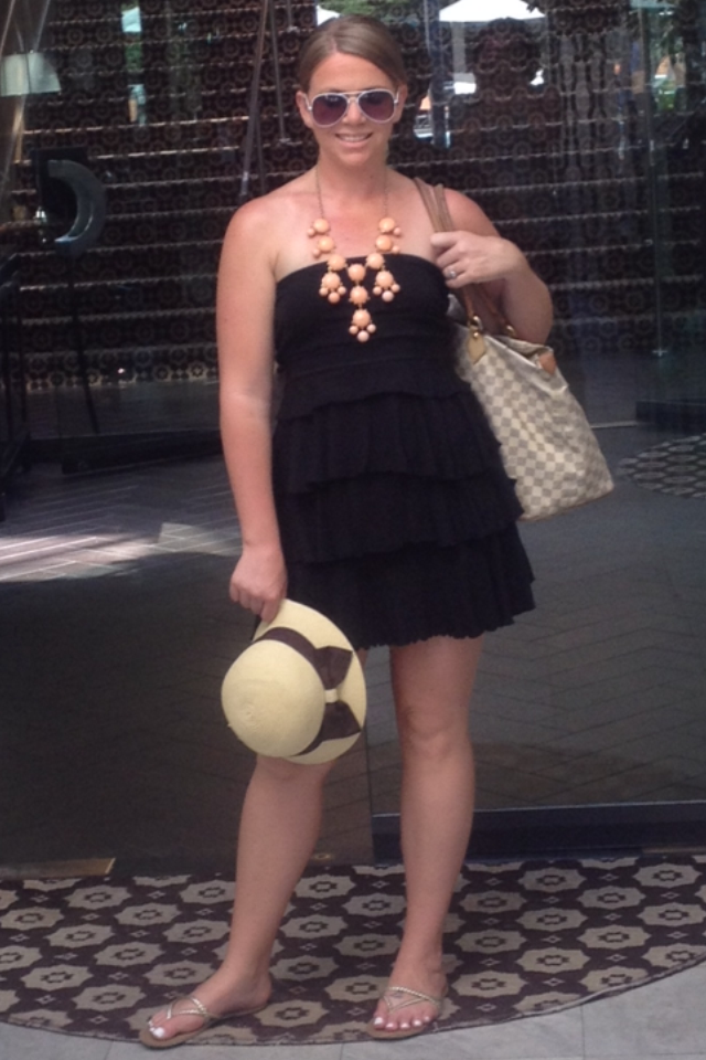 Dress: Express (old), Sandals: Charlotte Russe, Hat: Nordstrom, Sunnies: Target, Tote: Louis Vuitton, Necklace: DenM Boutique
