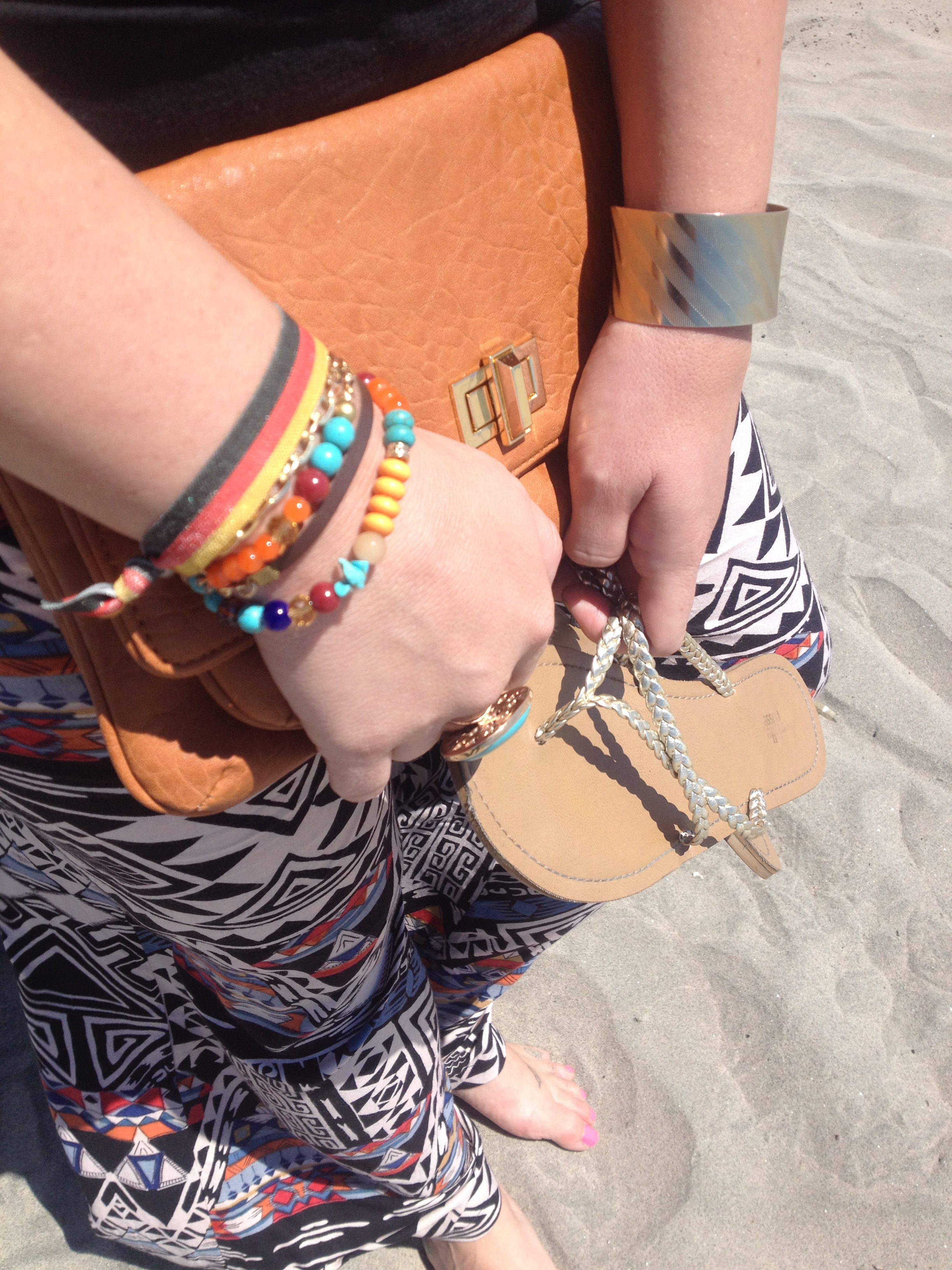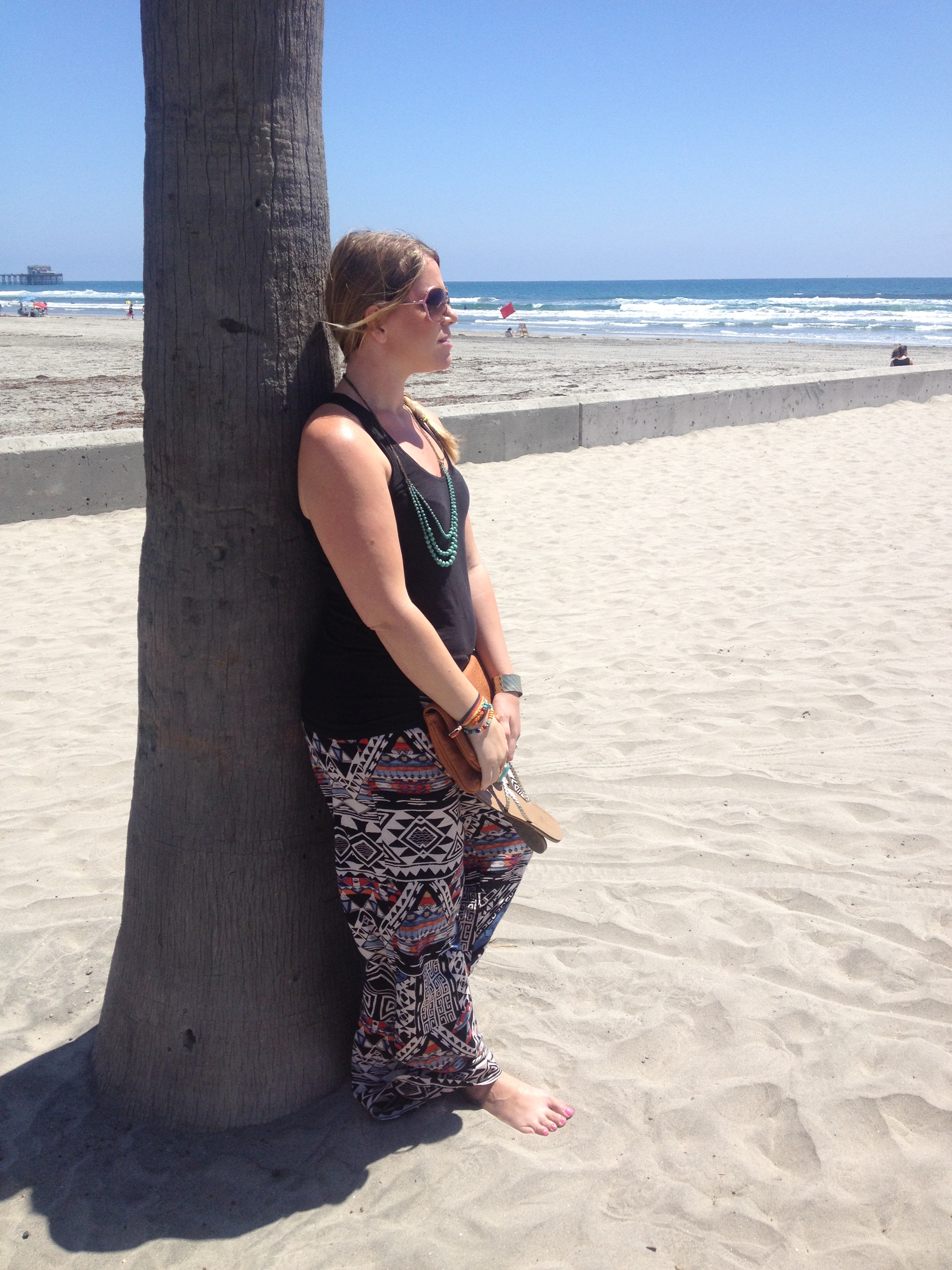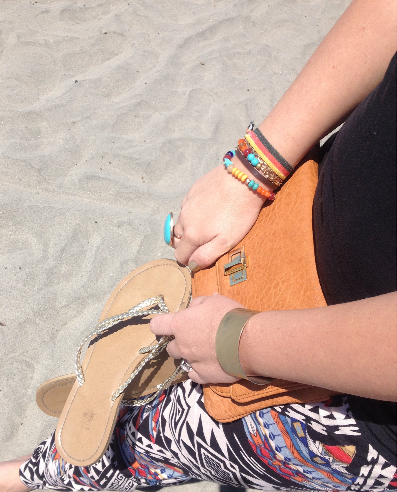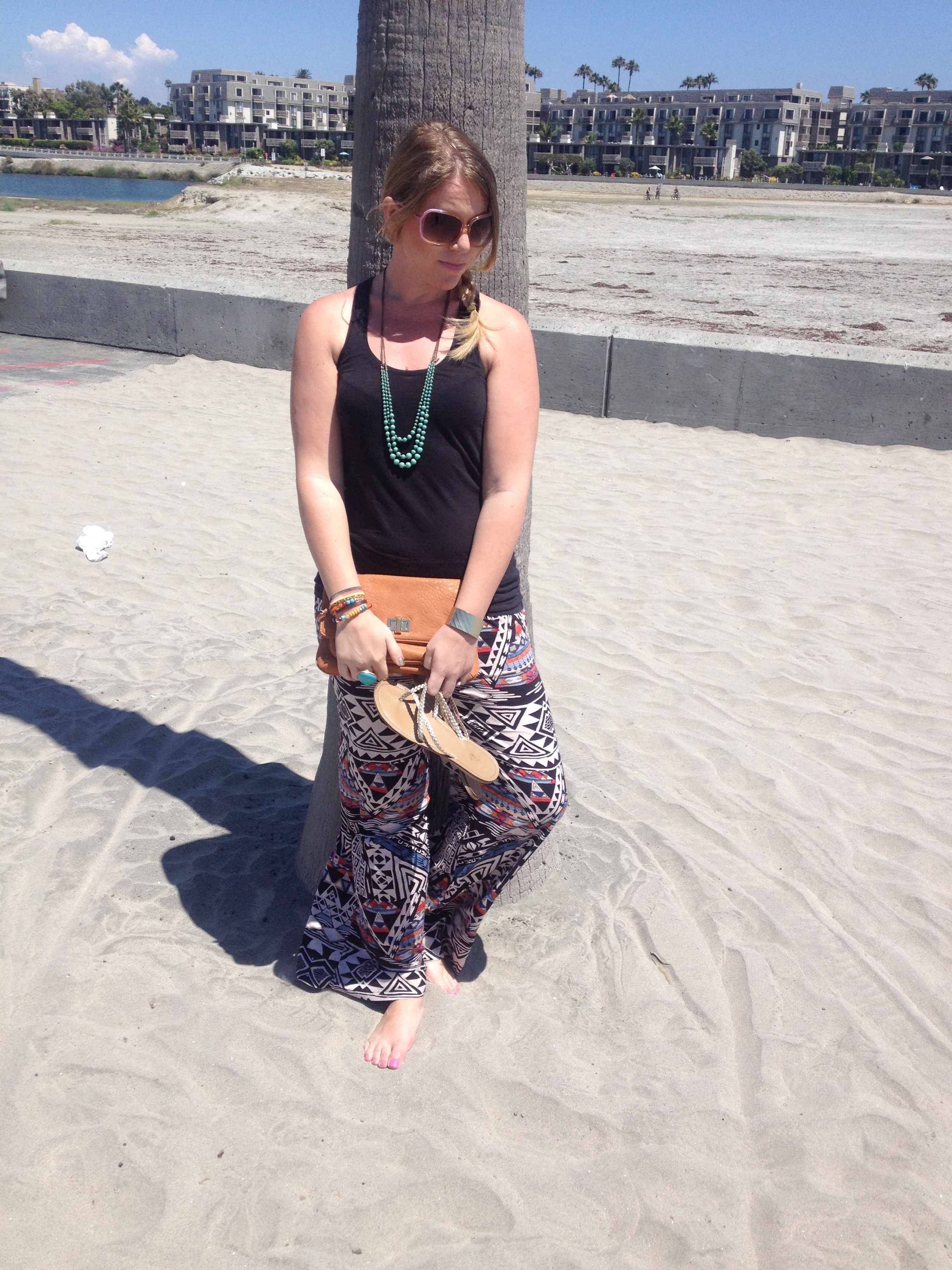 Tank & Turquoise Necklace: Nordstrom, Gold Cuff & Beaded Bracelet: Paperdolls Boutique, Germany Bracelet: Forever21, Sandals: Charlotte Russe, Pants: Diane’s Beachwear, Sunnies: Juicy Couture, Clutch: Neiman Marcus