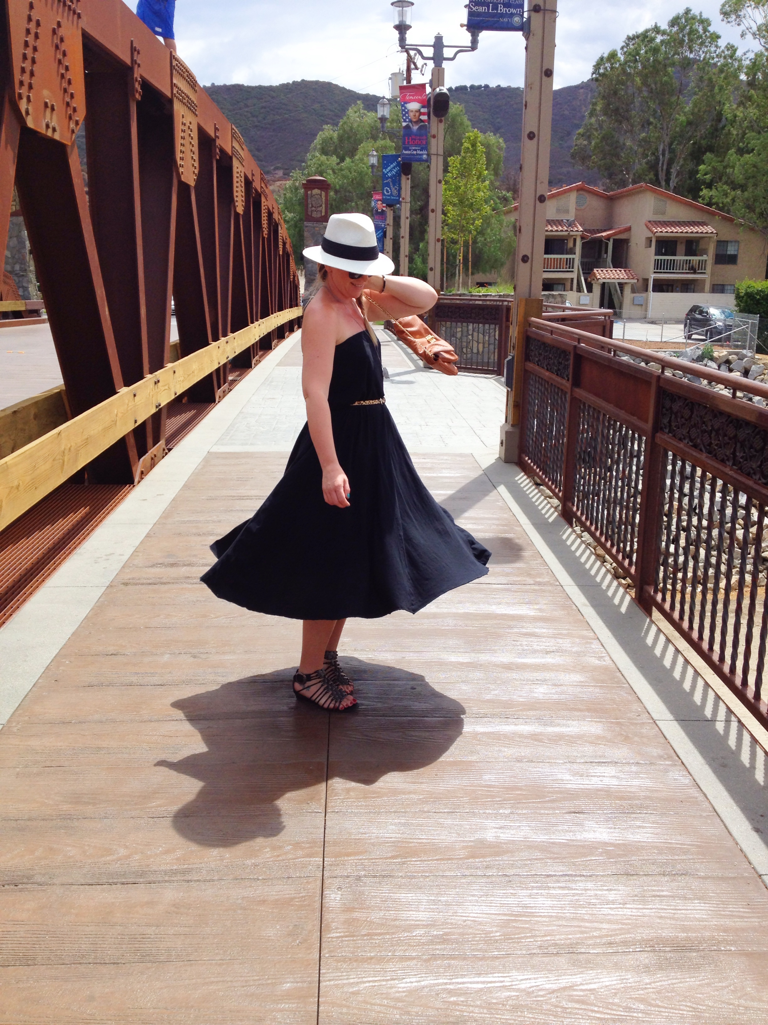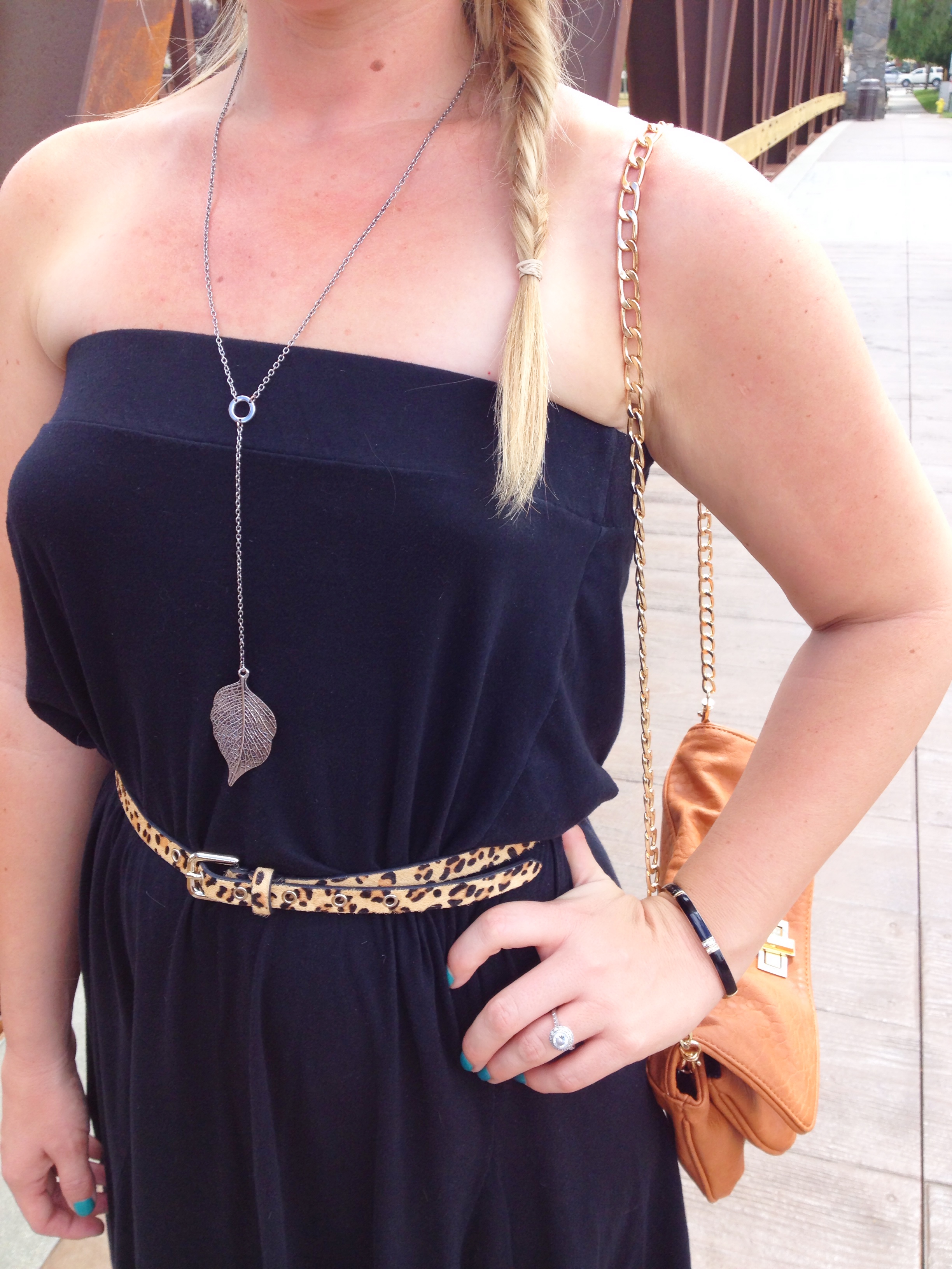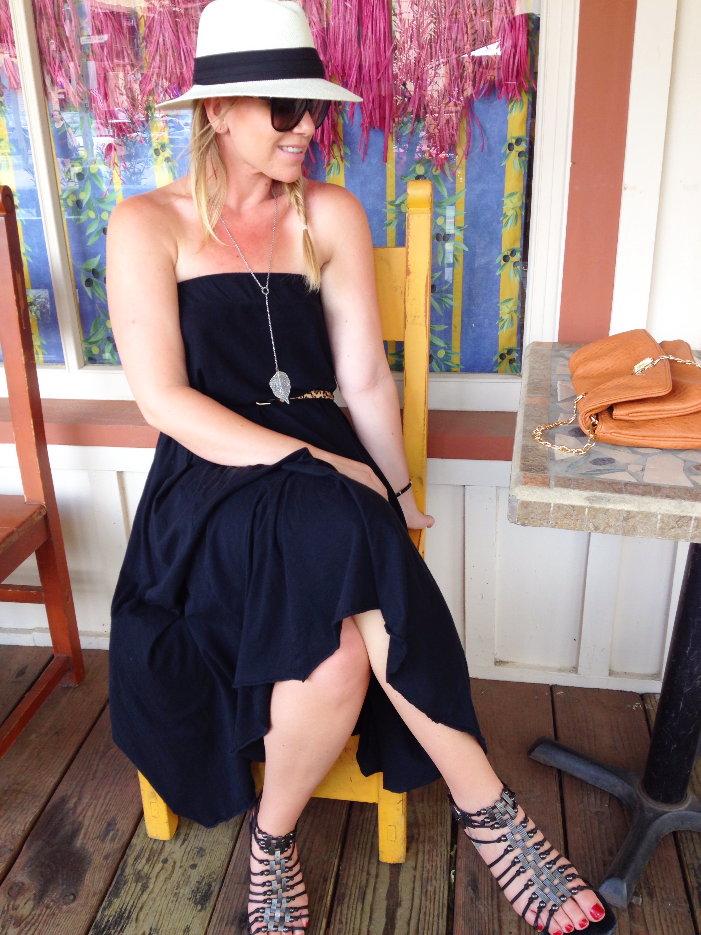 Dress: Michael Stars, Sandals: MTNG (old but still some cute styles HERE), Belt: Express (On Sale), Necklace: C/O Forever21, Hat: Scala (cute options at Nordstrom), Bag: Neiman Marcus, Bracelet: Charming Charlie (similar HERE)