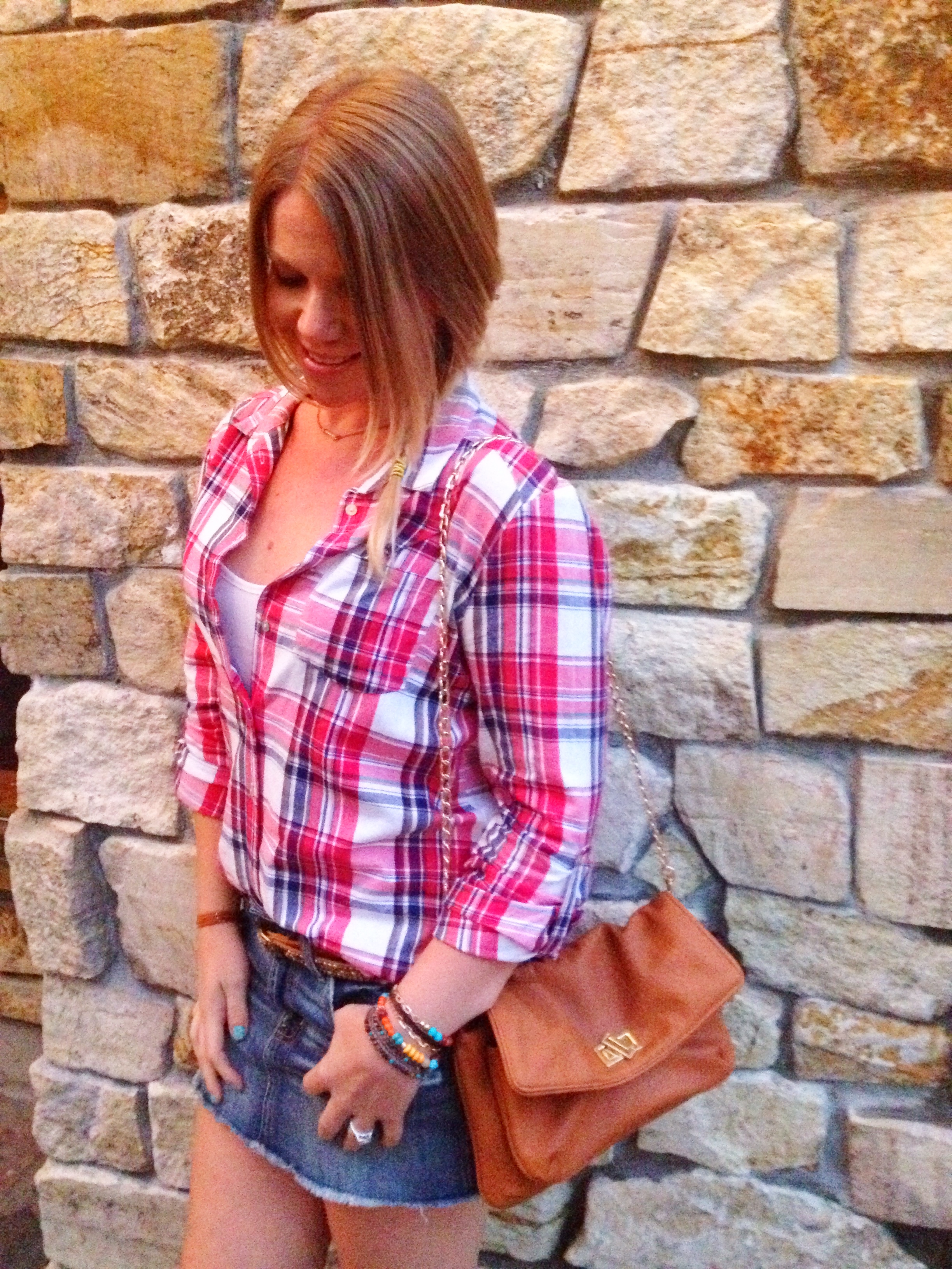 Skirt: American Eagle, Flannel, Necklace, and Beaded Bracelet: Paperdolls Boutique, Sandals: Charlotte Russe, Belt: Forever21, Bracelets: Gorjana, Energy Muse, Bag: Neiman Marcus