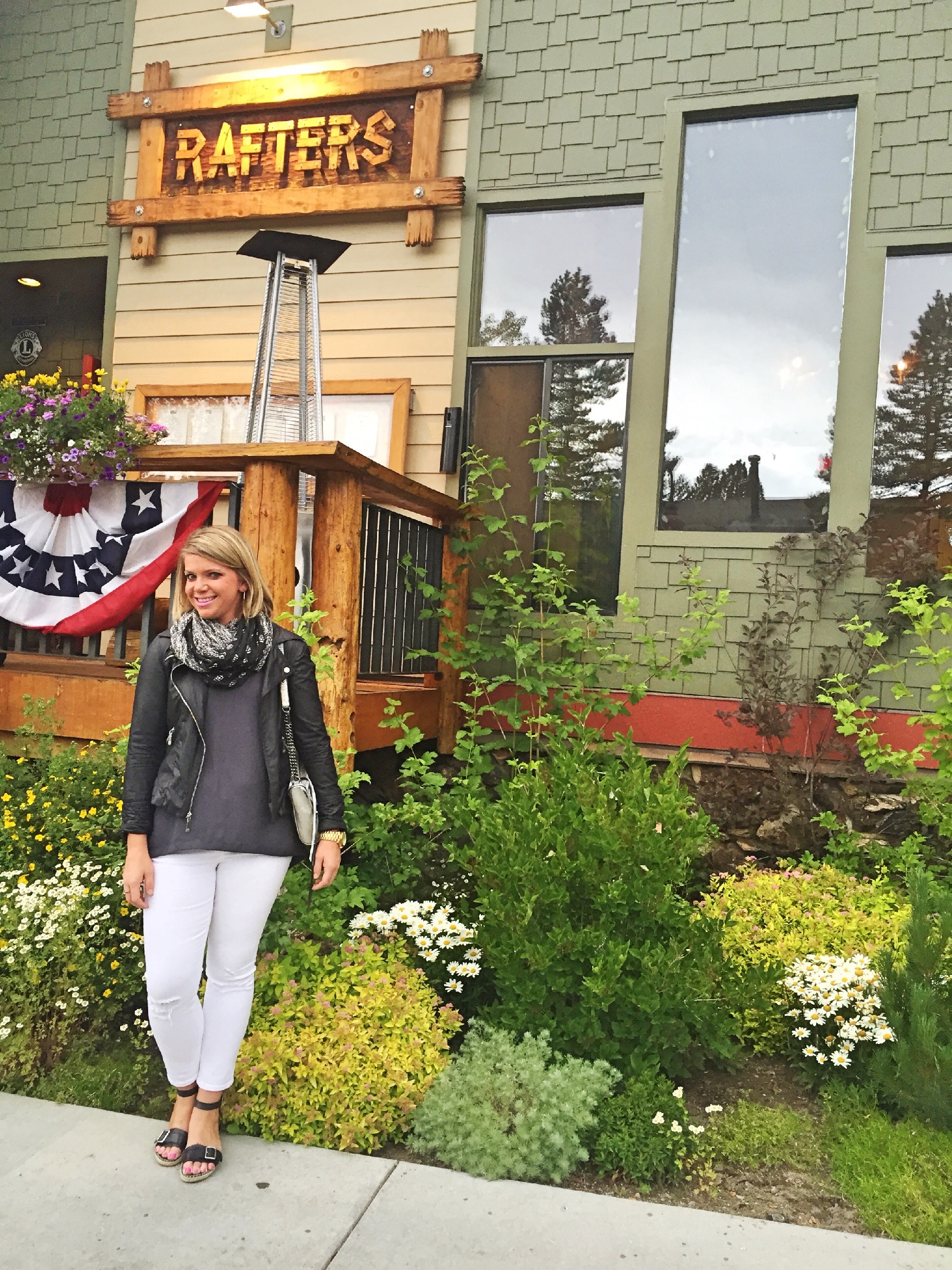 This look was actually from our first night in Mammoth Lakes. We left Palm Springs at 110 degrees and humid only to arrive in Mammoth to 60 degrees and rainy. Thankfully I packed some cool weather pieces including my nylon moto jacket from 2 years ago. It’s light weight and easy to pack but works well for drizzly days.