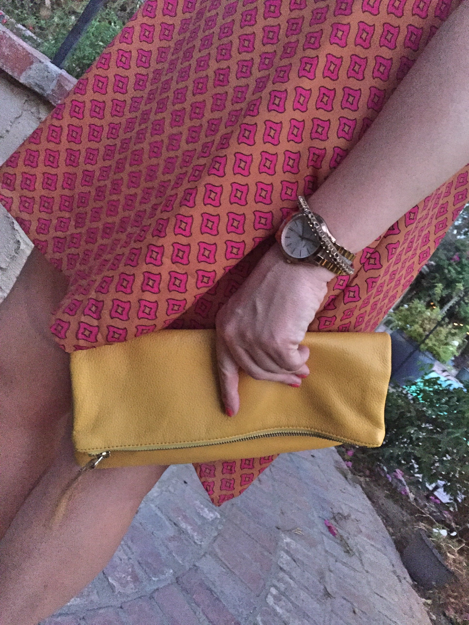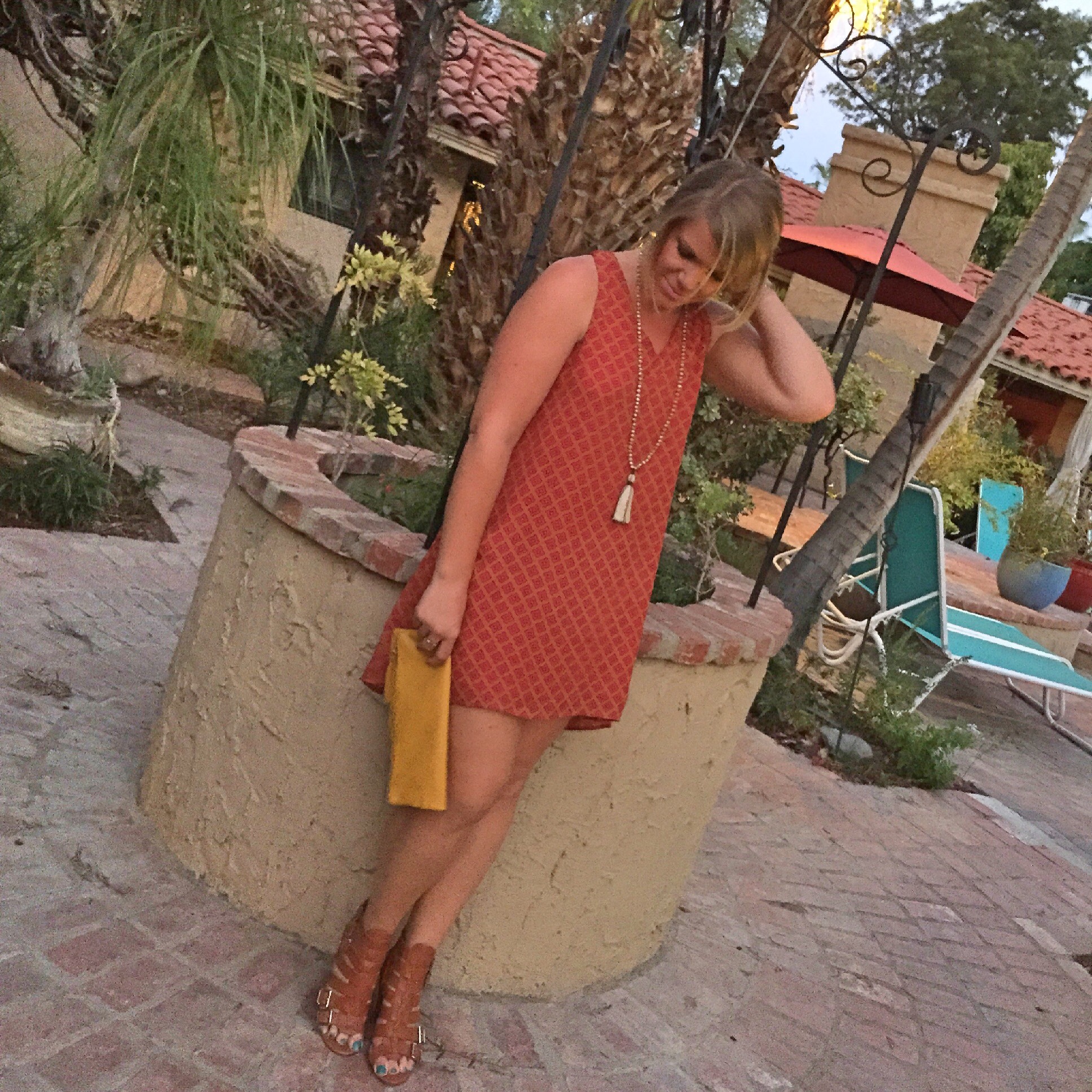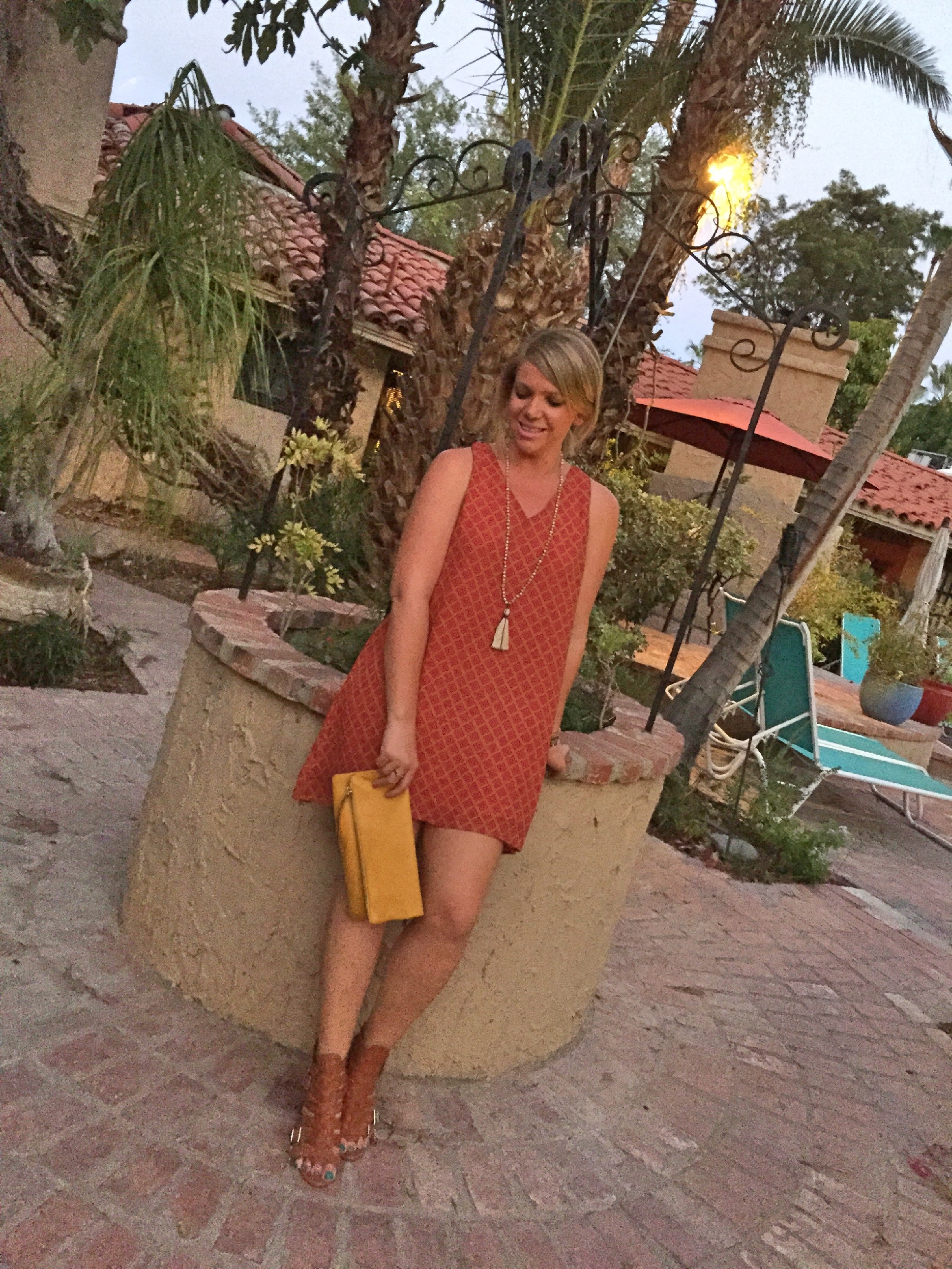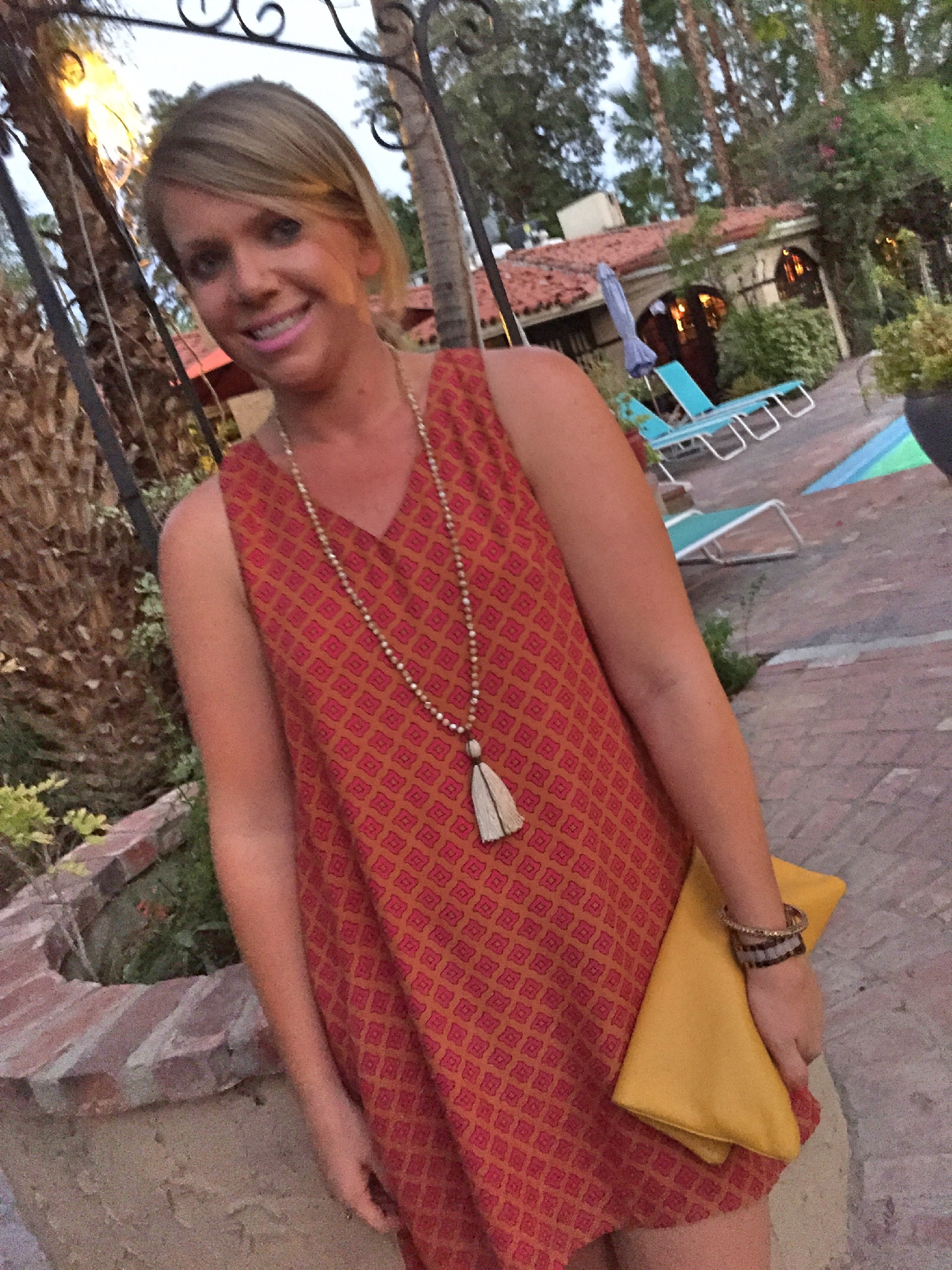 I am seriously in love with this yellow clutch a friend gave me a few weeks back. I have been using it non stop; everywhere from Palm Springs to Mammoth and Tahoe. I wore this little number to drinks with Brooke from The Trapped Fashionista at Villa Royale. If you have been following the blog for a while you may recognize this patterned shift dress. I found it at Nordstrom Rack 2 Summers ago and it just feels so Palm Springs I find myself defaulting back to it pretty often. My shoes and necklace are also Nordstrom Rack finds…seriously, the cutest stuff!!!