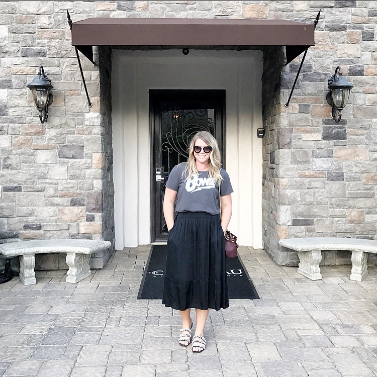 Read MoreTee: Daydreamer (wearing size Large) similar option HERE and HERE Skirt: Enza Costa (wearing size 3) similar option HERE Slides: Zara Bag: Zara